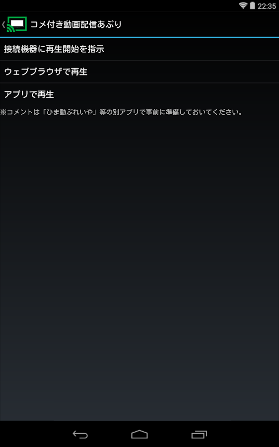 ・Androidのローカル上にある動画ファイルをChromeCastやHTML5対応のウェブブラウザを搭載した機器でコメント付きで再生する事ができます。・アプリからプレイヤーをリモートで操作することもできます。